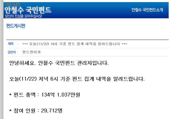 22일 <안철수 국민펀드> 홈페이지에 따르면 오후 6시 기준 집계내역은 134억1,037만원이다.