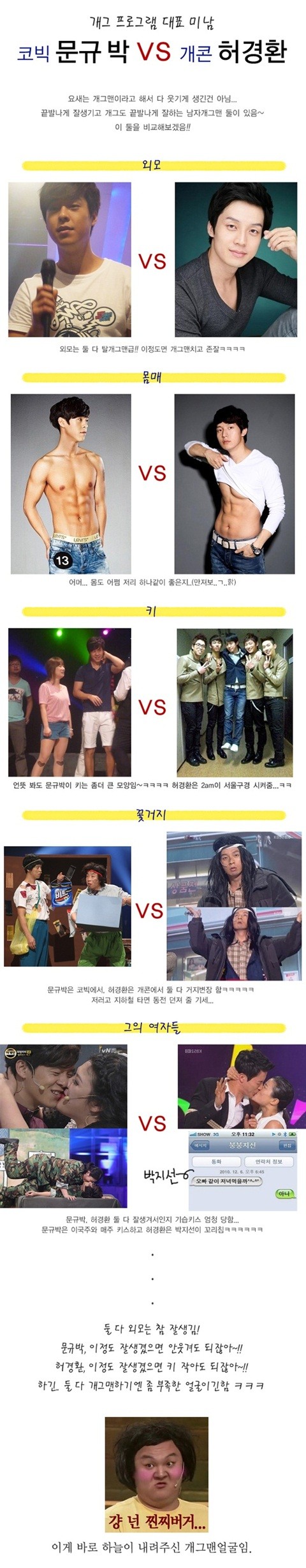 '개그 프로그램 대표 미남 코빅 문규 박 VS 개콘 허경환'이라는 제목의 사진에는 외모부터 몸매, 키, 꽃거지, 함께해 왔던 여자 파트너들까지 한 눈에 알아보기 쉽게 비교해 놓아 보는 이들의 웃음을 자아낸다.