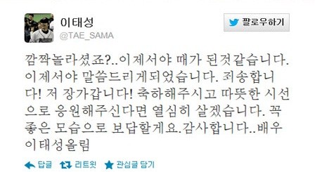 한편, 지난 2005년 영화 '사랑니'를 통해 연기자로 데뷔한 이태성은 이후 MBC 드라마 '살맛납니다', '애정만만세', SBS 드라마 '옥탑방 왕세자' 등 다수의 작품에 출연했다.