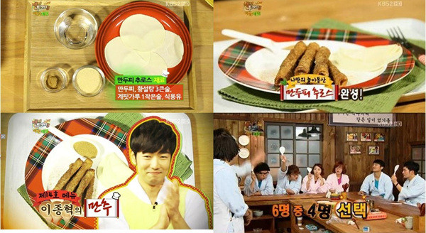 이날 '해피투게더'의 인기코너 '야간매점'에는 이종혁이 만두피를 이용해 손쉽게 만드는 간식인 '만두피 추로스(만추)' 레시피를 소개했다.