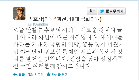 송호창 무소속 의원이 23일 "오늘 안철수 후보의 사퇴는 새로운 정치의 끝이 아니라 차원이 다른 시작"이라고 밝혔다. 이날 오후 8시 20분, 안 후보가 사퇴를 선언한 직후 트위터에서다.