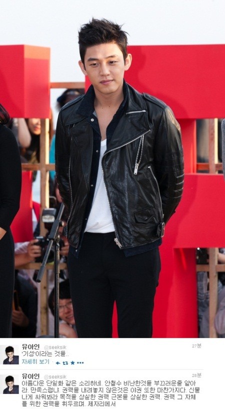 배우 유아인(24. 본명 엄홍식)이 안철수 사퇴선언에 소신 발언을 했다.유아인은 11월 23일 자신의 트위터에 "큰 그릇을 봤다. 진짜 새로움을 봤다. 연예인은 투표권 없나. 연예인은 트위터에 셀카만 올려대야 하나. 나는 내가 원하는 것을 원하고 내가 느끼는 것을 느낀다. 나는 내게 주어진 한 표의 크기만큼 생각했고 그만큼 고민했고 주어진 크기만큼 발언했다"는 글을 남겼다.