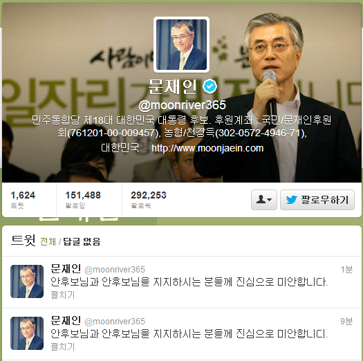 "정치혁신과 새정치에 대한 무거운 책임을 통감합니다. 안철수 후보의 진심과 새로운 시대를 향한 염원을 정권교체를 통해 반드시 이루겠습니다.