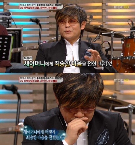 가수 박강성이 새 어머니를 생각하며 뜨거운 눈물을 흘렸다.박강성은 23일 방송된 MBC '기분좋은 날'에 출연해 새 어머니에게 반항했던 과거를 떠올리며 참회의 눈물을 쏟아 안타까움을 자아냈다.