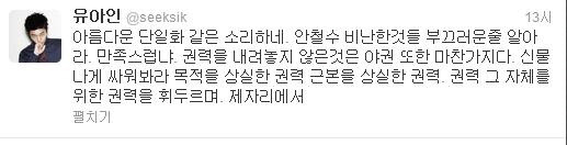 "안철수 비난한것들 부끄러운줄 알아라. 만족스럽냐. 권력을 내려놓지 않은것은 야권 또한 마찬가지다. 신물나게 싸워봐라 목적을 상실한 권력 근본을 상실한 권력. 권력 그 자체를 위한 권력을 휘두르며. 제자리에서."