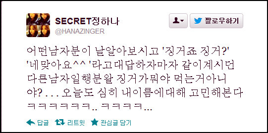 징거는 25일 자신의 트위터에 "어떤 남자분이 날 알아보시고 '징거죠? 징거?'라고 물었다. 내가 '네. 맞아요'라고 대답하자마자 같이 있던 다른 남자 일행분이 '징거가 뭐야. 먹는 것 아냐?'라고 했다. 오늘도 심히 내 이름에 대해 고민해 본다"라고 썼다.