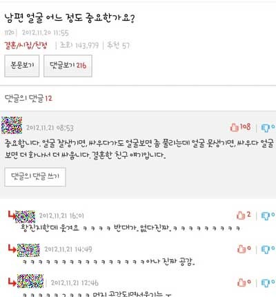 사진은 여성 커뮤니티의 질문과 답변으로 보인다. 한 여성이 "남편의 얼굴이 결혼생황에서 얼마나 중요하냐"고 묻자 다른 네티즌이 '친구의 이야기'라며 답글을 단다.