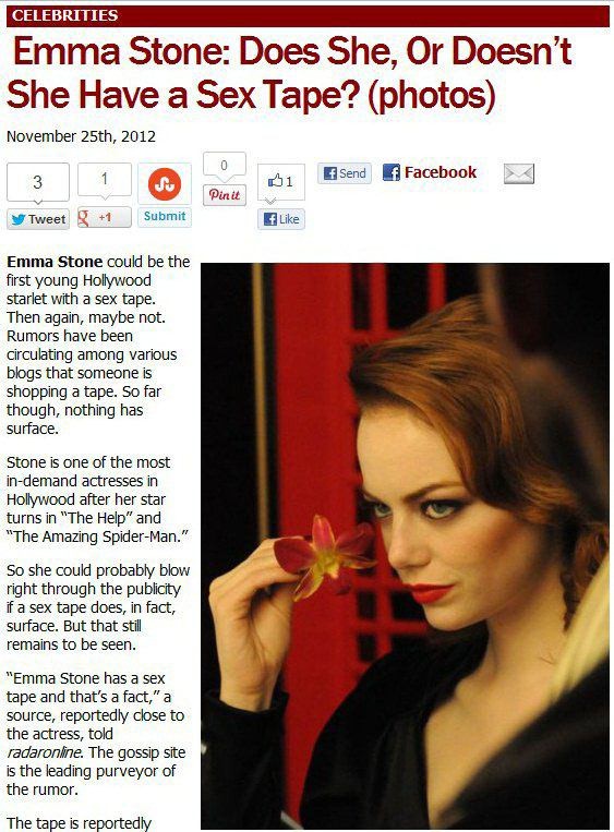 미국 현지 언론은 "엠마스톤이 무명시절 촬영한 마이너성향의 음란 동영상이 존재하는 것으로 확인됐다"며 "아직 시장에 유포되지는 않았으나 널리 퍼지는 것은 시간 문제"라는 의견을 덧붙였다.