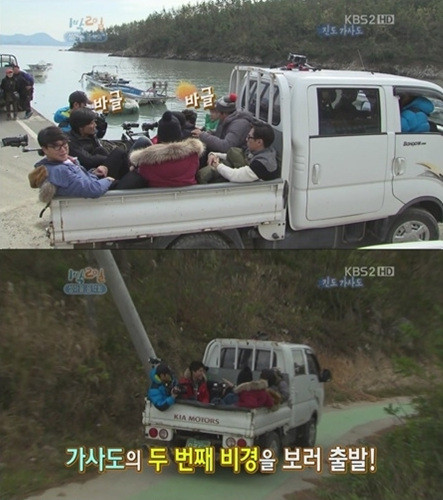 지난 25일 방송된 KBS 2TV '해피선데이-1박 2일(이하 1박 2일)'에서는 '1박 2일' 멤버들과 게스트 윤상, 윤종신, 유희열이 트럭 적재함에 탑승해 해변도로를 따라 이동하는 장면이 전파를 탔다.