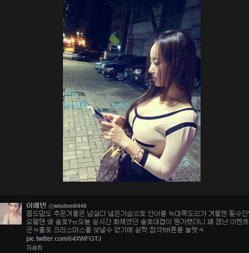 이예빈은 26일 자신의 트위터와 페이스북에 “몸도 마음도 추운겨울은 너무 싫다. 넓은 가슴으로 안아줄 늑대목도리가 겨울에는 필수인데 이럴 때 왜 솔로? 오늘 화제였던 솔로대첩 꽤 재미난 이벤트! 홀로 크리스마스를 보낼 수 없기에 살짝 참석 버튼을 눌러요”라는 글과 함께 사진 한 장을 게재했다.