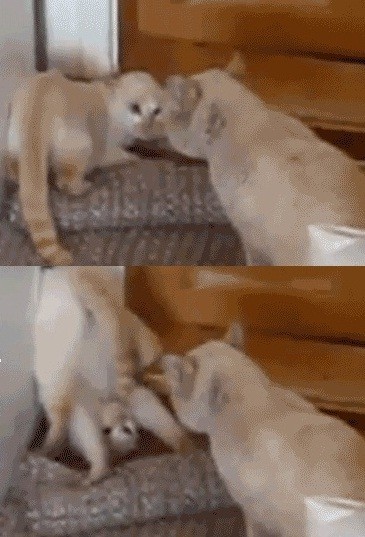 공개된 영상 속에는 고양이 두 마리가 서로를 견제하는 듯한 모습이 담겨 있다. 고양이 한 마리는 다른 고양이를 향해 경계하는 눈빛을 보내며 몸을 뒤집어 분노를 표출하는 모습이 마냥 귀엽다.