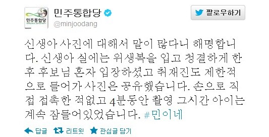 민주통합당은 27일 공식 트위터(@minjoodang)를 통해 "신생아 사진에 대해서 말이 많다니 해명 한다"며 "신생아실에는 위생복을 입고 청결하게 한 후 후보 혼자 입장했고 취재진도 제한적으로 들어가 사진은 공유했다"고 해명했다.