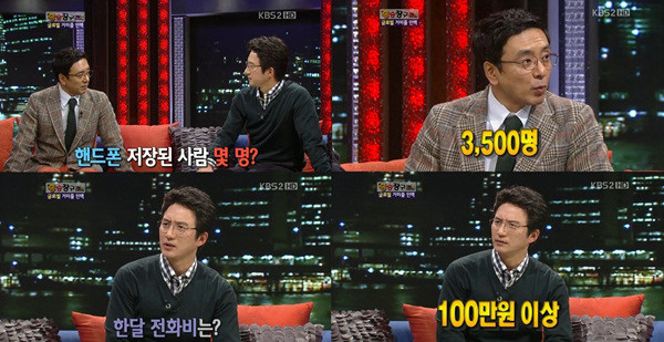이어 MC 탁재훈은 "그럼 전화비는 얼마 나오냐"고 물었고 정준호는 "한 달에 100만 원 이상정도 나온다"고 답해 다시 한 번 MC들을 경악케했다.