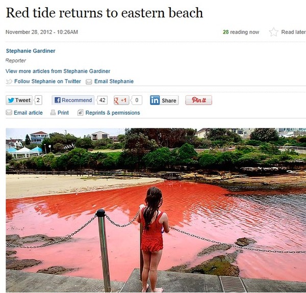 호주 시드니의 유명 관광지인 '클로벨리 비치(Clovelly Beach)'가 최근 핏빛으로 물들어 충격을 안기고 있다.