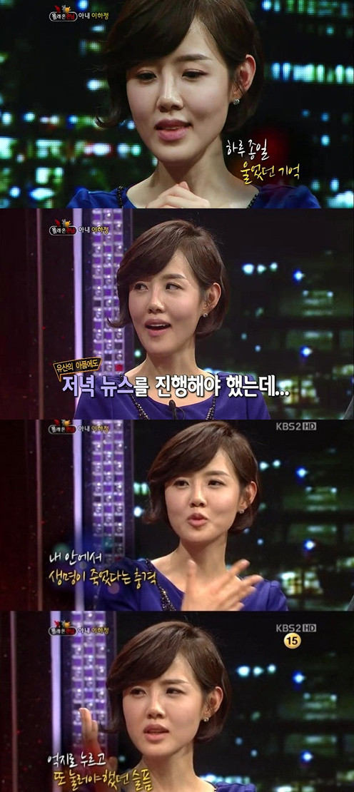 그녀는 “정말 몇 개월이 지났지만 아직도 입이 떨어지지 않는다. 하루 종일 눈물만 났다”고 말해 안타까움을 자아냈다. 이어 “당시 저녁 8시 뉴스를 진행할 때였는데 내 안에 있는 생명이 죽었다는 생각을 하니 말이 안 나왔다. ‘내가 뭘 하고 있는 거지?’ 이런 생각만 들고 믿고 싶지 않았다”고 전했다.