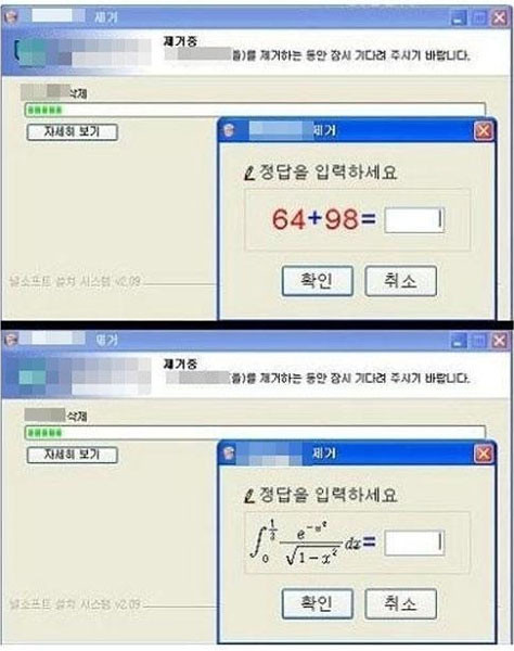 사진 속에서 한 이용자가 프로그램을 제거하려고는 과정에서 ‘삭제하시겠습니까?’라는 질문 대신 ‘64+98’의 정답을 입력하라고 요구한다. 이는 누구나 풀 수 있는 문제로 ‘162’를 입력하면 프로그램을 삭제할 수 있다.