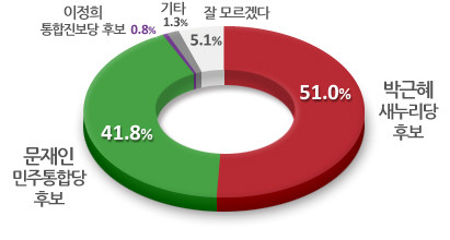 박근혜 새누리당 대선후보가 문재인 민주통합당 대선후보를 다자대결에서 9.2% 포인트 앞서는 것으로 나타났다.안철수 후보의 사퇴 이후 문재인 후보와의 지지율 격차가 점차 벌어지는 모습이다.대선주자 다자대결여론조사 전문기관 모노리서치가 28일 전국 남녀 유권자 2,310명을 대상으로 제18대 대통령 선거 관련 정례조사를 실시한 결과 다자대결에서 박근혜 새누리당 후보 51.0%, 문재인 민주통합당 후보 41.8%의 지지율이 나왔다. 이정희 통합진보당 후보는 0.8%, 기타후보는 1.3%였으며 ‘잘 모름’ 응답은 5.1%였다.안철수 전 무소속 후보가 사퇴 선언을 하기 전이었던 직전 정례조사(11월 14일)에서 박근혜-문재인 가상 양자대결에서는 박근혜 46.8%-문재인 45.5%였다. 보름여 전과 비교할 때 박근혜 후보는 지지율 상승, 문재인 후보는 하락 추세를 보인 셈이다.박근혜 후보의 상승세는 여성 응답률에서 두드러졌다. 박 후보의 여성 지지율은 54.2%로 남성 47.7%보다 6.5% 포인트 높았다. 직전 조사에서는 남녀 지지율이 각각 43.1%로 동률을 보였던 것과 비교할 때 박 후보의 ‘여성대통령’ 강조가 여성유권자들에게 일정하게 반응을 이끌어 내는 것으로 보인다.박 후보는 40대와 전라권에서도 주목할 만한 상승세를 보였다. 40대 박근혜-문재인 지지율은 각각 46.1의 동률을 나타냈다. 전라권에서 박 후보의 지지율은 직전 조사에서는 12.4%였으나 이번 조사에서는 26.6%로 상승했다.두 후보의 최대 관심 격전지역으로 손꼽히는 충청권과 경남권 지지율은 충청권에서는 박근혜 58.1%-문재인 36.2%, 경남권은 박근혜 56.5%-문재인 36.3%로 나타냈다.안철수 후보 사퇴 후 지지층 표심안철수 전 무소속 후보를 지지했다고 밝힌 응답자들은 현재 57.3%가 문재인 후보, 27.5%가 박근혜 후보에게 투표하겠다고 답했다. 11.3%는 잘 모르겠다고 답했다.안철수 전 후보 지지 응답자들은 지난 2007년 대선에서는 36.8%가 이명박 당시 새누리당 후보, 31.0%가 정동영 민주신당 후보, 6.6%가 이회창 무소속 후보, 6.0%가 문국현 창조한국당 후보, 4.3%가 권영길 민주노동당 후보에게 투표했다고 답했다.안 전 후보 지지층의 표심이 이번 대선의 최대 변수로 떠오르는 가운데 지난 2007년 대선 투표 성향을 살펴보면 다양한 성향의 유권자들이 혼재되어 있음을 확인할 수 있다.안철수 대선정국 행보안철수 전 무소속 후보가 조사 전날인 27일 향후 행보와 관련 ‘지지자의 판단에 따를 것’이라고 언급한 가운데 안철수 전 후보의 대선정국 행보를 묻는 질문에 안철수 후보를 지지했다고 밝힌 응답자의 41.7%는 ‘문재인 후보 선거운동에 적극 동참해야 한다’, 38.1%는 ‘모든 선거운동에 관여하지 말아야 한다’고 답했다. 7.9%는 ’문재인 후보 선거운동에 소극적으로 동참해야 한다‘, 12.3%는 ’잘 모르겠다‘고 응답했다.안철수 전 후보의 행보에 관심이 집중되는 상황에서 안 후보 지지층은 단일화의 대상이었던 문재인 후보 지원에 긍정과 부정이 절반씩 갈린 모습을 보이고 있다.이와 비교해 대선 다자대결 응답자 중 문재인 후보 지지 응답자들은 75.7%가 ‘적극 동참’에, 박근혜 후보 지지 응답자들은 76.4%가 ‘관여하지 말아야’라고 답했다.대선 투표 여부대선 최고 변수 중 하나로 손꼽히는 투표율과 관련한 대선 당일 투표 여부 조사에서는 62.5%가 ‘반드시 투표’(적극 투표층), 24.4%가 ‘별 일이 없다면 투표’(소극 투표층), 6.9%가 ‘투표 당일 결정’(부동층), 3.4%가 ‘지지 후보가 없어 투표하지 않겠다’(자발적 비투표층), 2.8%가 ‘업무 등 개인사정으로 투표하기 힘들다’(비자발적 비투표층)는 응답률이 나왔다. 지난 10월 15일 투표 여부 조사에서 ‘반드시 투표’가 59.8%였다.적극 투표층은 박근혜 후보 지지 응답자가 52.8%, 문재인 후보 지지 응답자가 44.2%였다. 또 자신을 보수 성향이라고 밝힌 응답자의 66.1%, 중도 성향 응답자 64.6%, 진보 성향 응답자의 60.8%가 적극 투표층이었다.지난 4월 총선에서 투표를 했다고 밝힌 응답자 중 이번 대선에서 박근혜 후보에게 투표하겠다고 밝힌 응답자는 51.7%, 문재인 후보 투표 응답자는 41.6%였다. 대체로 보수성향/박근혜 후보 지지 응답자들이 적극 투표 의사가 높은 것으로 나타났다.정권교체 여부/대선 투표 여부이번 대선에서 ‘정권교체가 이뤄져야 한다’고 답한 응답자는 55.4%, ‘그렇지 않다’는 33.1%, ‘잘 모름’은 11.5%였다. 정권교체 긍정 응답자 중 적극 투표층은 64.4%, 부정 응답자 중 적극 투표층은 70.0%였다. 반대로 자발적 비투표층은 정권교체 긍정 응답자의 3.9%, 부정 응답자의 1.6%였다.정당지지도/총평정례 정당 지지도 조사에서는 새누리당 41.9%(직전 조사 대비 0.9%P▲), 민주통합당 29.7%(1.6%P▼), 진보정의당 1.8%(0.8%P▲), 통합진보당 1.4%(0.8%P▼), 기타 정당 2.58%(1.5%P▼), 무당층 22.4%(2.2%P▲) 등이었다.“안철수 전 후보가 강세를 보인 연령과 지역에서 박근혜 후보의 상승세가 두드러진 모습 등을 볼 때 안 전 후보 지지층의 표심이 문재인 후보에게 많이 가진 않은 것으로 보인다.”
