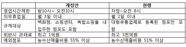 대형마트 규제를 강화하는 유통산업발전법 개정안이 11월21일 국회 법제사법위원회 상정이 보류되면서 혼란을 겪고 있다. 대형유통업체와 자영업자들의 대타협 상생방안도 위기를 맞게 됐다. 양쪽의 의견이 합의점을 찾지 못하면서 대타협을 이루는 듯 했던 협의회도 파행될 위기를 맞게 됐다. 협의회가 탄생한 지 불과 4일 만에 깨진 것.전국상인연합회는 19일 최소한 법적인 규제 내용에 못 미치는 대형 유통업체들의 자율규제 내용은 상생의 의미가 없는 생색내기에 불과해 협의회에 참석할 수 없다며 불참의사를 밝혔다.대형유통업체와 자영업자와의 불협화음은 협의회가 열렸던 11월15일부터 감지할 수 있었다. 홈플러스가 앞으로는 상생을 외치면서도 오산 세교점과 남현동점의 개설 등록 신청을 강행하는 등의 앞뒤 다른 행보를 이어갔기 때문이다.홈플러스는 서울 마포구 합정점, 관악구 남현점, 오산시 세교점 등 신규 출점 점포들에 대해 유통산업발전협의회 합의를 거쳐 출점할 방침이라고 밝혔지만 협의회가 와해되면 계획대로 추진될 것으로 보인다.유통산업발전법 개정안은 영업시간, 의무휴업일 등 규제 강화를 골자로 한다.대형유통업체들의 ‘꼼수’로 지적됐던 백화점, 쇼핑센터, 복합쇼핑몰 내 입주한 대형마트와 SSM도 규제대상에 포함한다. 농수산물매출비중을 이유로 규제대상에서 벗어나는 업체를 견제하기 위해 예외점포 대상도 51%에서 55%로 강화한다.과태료가 많지 않다며 의무휴업일 영업 강행을 해 온 코스트코와 같은 업체를 줄이기 위해 위반시 과태료도 3천억원에서 1억원으로 대폭 상향조정한다.영업시간 제한도 ‘자정~오전 8시까지’에서 ‘밤 10시~ 오전 10시까지’로 4시간 더 늘어난다. 즉 10시 이후 저녁과 출근길 소비자들로 얻는 매출을 잃게 되는 셈.