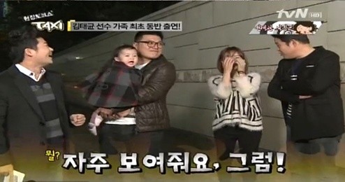 29일 방송될 tvN '현장 토크쇼 택시'에서는 야구선수 김태균과 함께 절친한 정근우 선수가 게스트로 참여했다. 이날 오프닝은 김태균의 집앞에서 진행됐는데, 김태균의 아내 김석류와 딸이 깜짝 등장해 눈길을 모았다.
