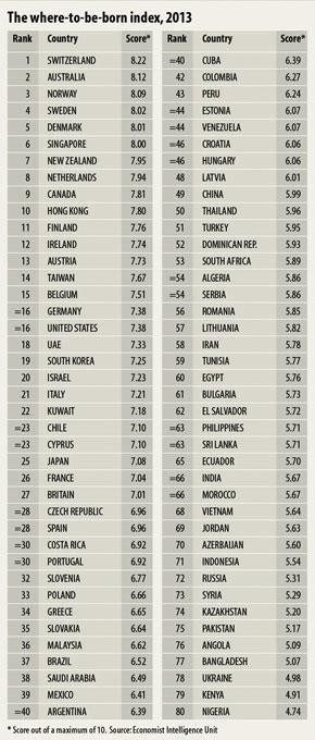 스위스가 ‘2013년 세계에서 가장 태어나기 좋은 곳’으로 꼽혔다.
