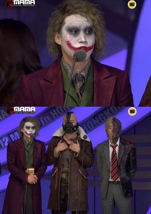 이날 에픽하이의 타블로, 미쓰라진, 투컷은 각각 영화 '다크나이트' 속 캐릭터인 조커, 베인, 투페이스 분장을 하고 무대에 올라 눈길을 사로잡았다. 특히, 타블로는 헤어스타일, 얼굴, 의상 등 조커와 싱크로율 100%를 자랑하며 진지하게 수상 수감을 전해 보는 이들의 웃음을 자아냈다.