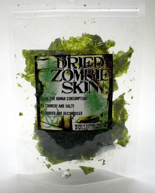 문제는 표장용지에 선명하게 인쇄돼 있는 상표. 직역하면 ‘말린 좀비의 피부’로 해석되는 문제의 김 포장은 네티즌들을 당혹스럽게 만들고 있다.