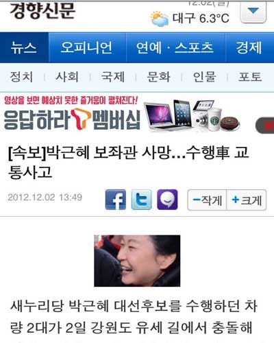 보도 내용은 경향 외에도 두세 곳이 함께 '오보'를 한 것이라 그럴 수 있지만 문제는 보도용 사진이었다. 故이 보좌관의 사망으로 가장 슬퍼할 박근혜 새누리당 대선후보가 활짝 웃는 사진이었다.