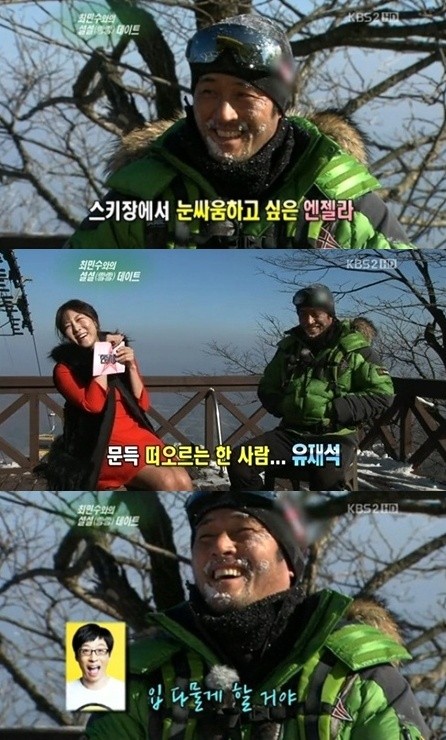 배우 최민수가 유재석에게 경고의 메시지를 날렸다.지난 1일 방송된 KBS 2TV '연예가중계'에서는 스키장에서 펼쳐진 리포터 김엔젤라와 최민수의 설설 데이트 현장이 공개됐다