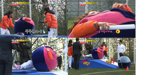 결국 유재석의 도움을 받아 일어난 김완선은 "다리에 힘이 없다"며 장애물을 굴러서 넘는 굴욕을 보여 또 한번 출연진을 폭소케했다.
