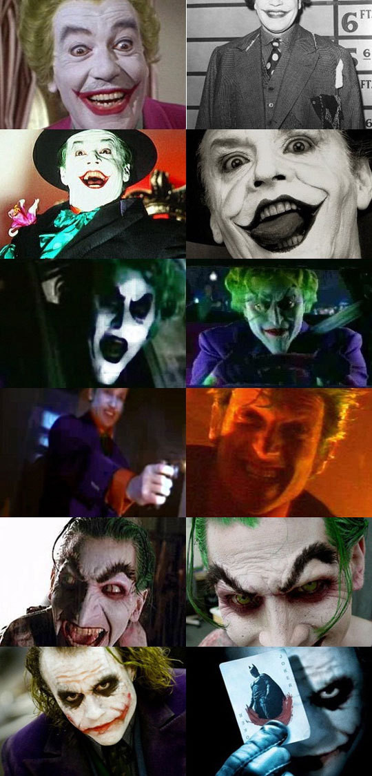 역대 조커들을 보면 처음 등장한 세자르 로메오부터 잭 니콜슨, 커티스 암스트롱 그리고 최근 ‘배트맨 시리즈-다크나이즈’의 히스 레저까지 각약각색의 표정과 분장 눈길을 끈다. 초창기 조커들은 의외로 귀여운 모습을 하고 있으며, 조커 얼굴의 상징인 찢어진 붉은 입과 창백한 얼굴은 비슷하지만 세월이 흐를수록 점점 섬뜩하게 변해가는 것을 볼 수 있다.