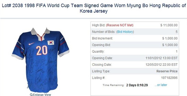 이 유니폼에는 98년 프랑스 월드컵에 출전한 한국 대표선수 전원의 사인이 들어 있어 고가의 낙찰이 예상되고 있다.