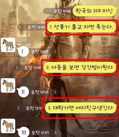공개된 사진 속에는 두 사람의 대화로 '1. 선풍기를 틀고 자면 죽는다', '2. 야동을 보면 강간범이 된다', '3. 대학 가면 여자친구가 생긴다'라는 내용이 담겨 있다. 특히, 미신을 하나씩 말할 때마다 이를 듣는 상대방의 느낌표 갯수가 늘어나 웃음을 자아낸다.