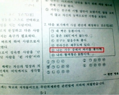 최근 한 온라인 커뮤니티 게시판에는 한 중학교 2012년 2학기 중간고사 시험지를 찍은 사진을 올렸다. 사진 속에는 싸이의 이름이 등장한 도덕시험지가 담겨 있다.