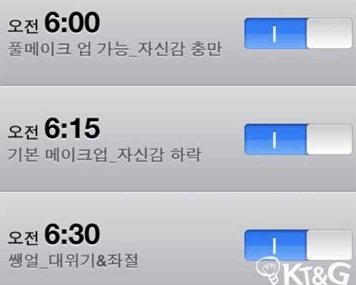 오전 6시에는 '풀메이크업. 자신감 충만'으로 되어 있고 오전 6시 15분에는 '기본 메이크업. 자신감 하락'이라 돼 있다.