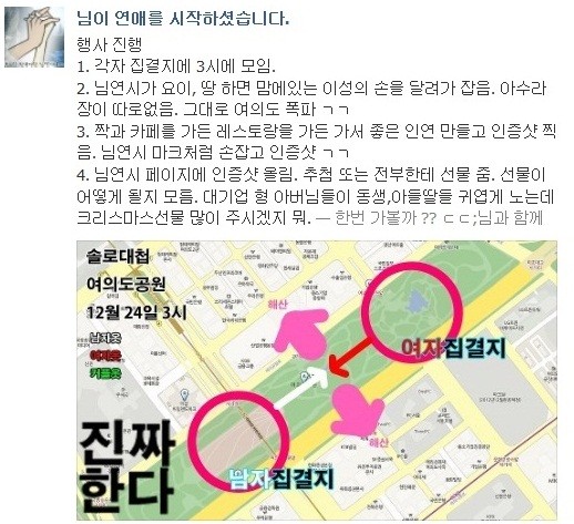 이 같은 행사는 지난달 3일 '님이 연애를 시작하셨습니다(님연시)'라는 한 대학생 네티즌이 자신의 페이스북 팬페이지에 "솔로 형 누나 동생분들, 크리스마스 때 대규모 미팅 한번 할까"라는 글을 올리면서 시작됐다.