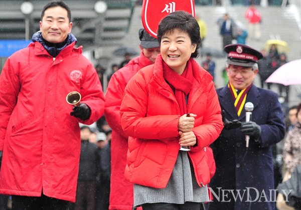 새누리당 박근혜 대통령 후보가 7일 서울시 동대문구 청량리역 앞 광장에서 구세군 자선냄비 기부 및 봉사를 펼쳤다.