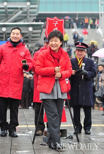 새누리당 박근혜 대통령 후보가 7일 서울시 동대문구 청량리역 앞 광장에서 구세군 자선냄비 기부 및 봉사를 펼쳤다.
