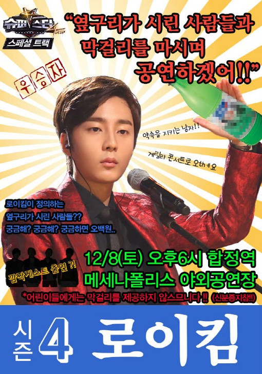 케이블채널 Mnet ‘슈퍼스터K4’ 측은 7일 공식 트위터에 “우승공약! 실천합니다! ‘슈퍼스타K4 우승자 로이킴 막걸리 게릴라콘서트’ 12/8일(토) 오후6시 합정역 10번 출구쪽 메세나폴리스 야외 공연장! 선착순 300명 입장입니다. 막걸리 받기 위해선 신분증 지참 필수!”라는 글과 함께 사진을 게재했다.