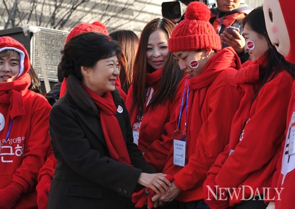 8일 오후 서울 광화문광장에서 열린 새누리당 서울지역 대규모 합동유세에서 한 대학생 유세단원이 자신이 끼고 있던 장갑을 벗어 박근혜 후보에게 건네자 박근혜 후보가 이를 사양하며 손을 잡아주고 있다.