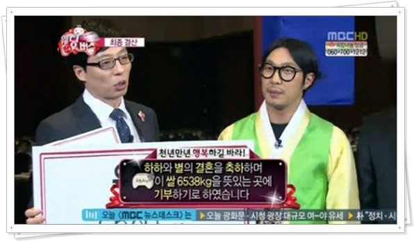 '무한도전' 제작진은 하하의 결혼을 축하하는 의미로, 결혼식에 맞춰 쌀을 기부하기로 결정했다. 제작진에 따르면 멤버들은 어려운 이웃에게 총 6538kg의 쌀을 기부할 방침이라고.