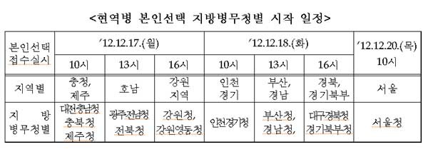 입영연기를 하지 않은 사람이 본인선택을 하지 않을 경우에는 12월 24일부터 26일 사이에 병무청에서 입영일자와 부대를 결정해 12월28일 병무청 홈페이지와 ARS(1588-9090)로 공개한다.