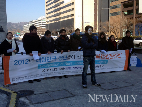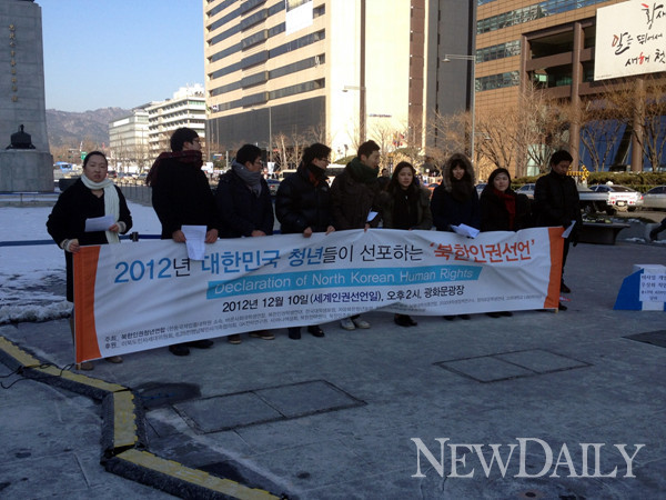 이날 북한인권청년연합은 추운 날씨에도 불구, 다음과 같은 '북한인권선언문'을 또박또박 읽어 내려갔다.