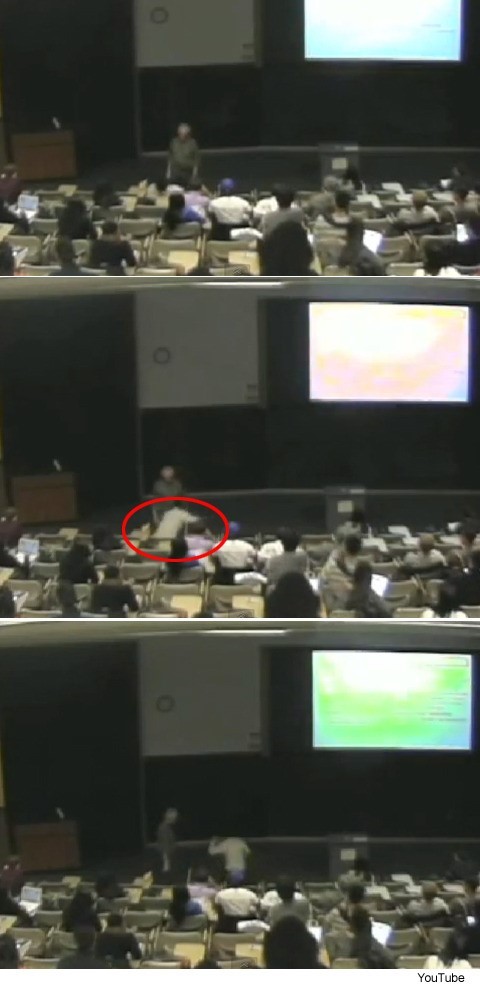 결국 정신을 차린 이 학생은 모든 상황을 알고 뒤통수를 긁으며 서둘러 자리로 돌아오고, 웃음이 터진 교수는 수업을 진행하지 못해 보는 이들을 폭소케 했다.