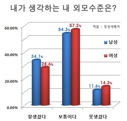 남성의 경우 전체 응답자 중 34.1%가 자신의 외모를 잘 생긴 것으로 평가했으며, 반면 여성은 28.6%만 자신의 외모가 '예쁘다고 생각한다'고 응답했다. 약 5.5%포인트 차이다.