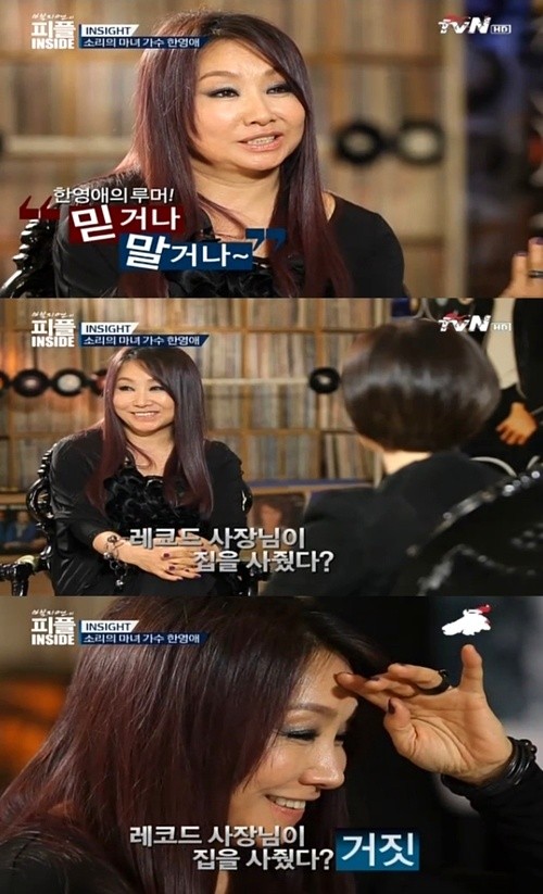 가수 한영애가 과거 스폰서 루머에 대해 속시원히 해명했다.한영애는 지난 10일 오후 방송된 케이블채널 tvN '백지연의 피플인사이드'에 출연해 지난 80년대 최고의 인기를 누리던 시절 황당했던 루머와 38년 가수 인생의 모든 것을 진솔하게 털어놨다.