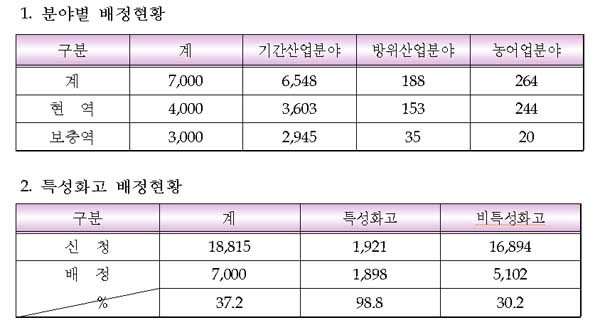이 가운데 특성화고(실업계고, 마이스터고) 졸업생은 신청인원 1,921명의 98.8%인 1,898명이다. 현역 대상자는 1,826명, 보충역은 72명으로 2012년 배정인원 1,351명 보다 40.5% 증가했다.