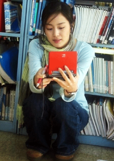 공개된 사진 속 김태희는 평범한 여대생 복장으로 도서관 바닥에 앉아 전자사전을 보고있다.