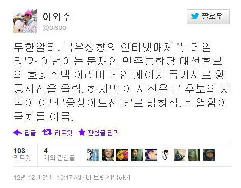 지난 9일 <뉴데일리>가 문재인 후보 저택의 항공사진 관련 보도를 내자 ‘트위터 대통령’이라고 불리는 소설가 이외수는 다음과 같은 글을 올렸다.