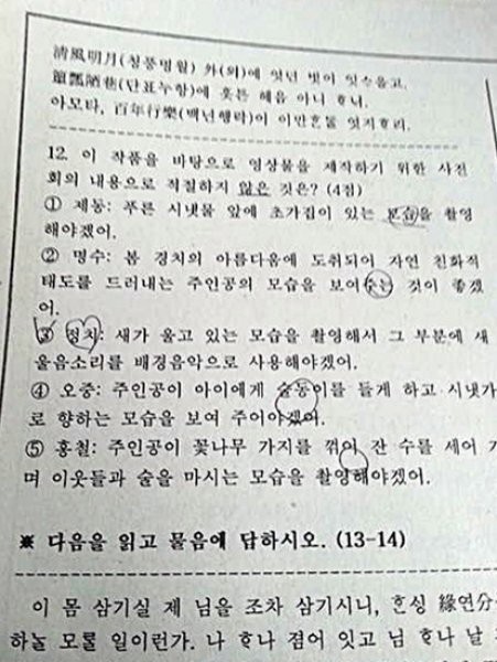 공개된 사진은 어느 학교의 국어 시험 문제를 촬영한 것으로 MBC ‘무한도전’의 ‘못친소 페스티벌’ 특집에 출연했던 김제동, 박명수, 조정치, 권오중, 노홍철의 이름이 오지선다 보기로 나와 있다.