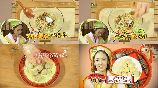 그녀가 소개한 '고날'의 레시피는 다소 복잡했다. 삶은 고구마를 으깬 후 각종 견과류를 섞어준다. 이후 요구르트와 소금, 계피가루, 꿀 등을 넣고 잘 섞은 재료들을 한 입 크기로 동그랗게 굴려 카스테라 가루를 골고루 묻혀주면 완성된다.
